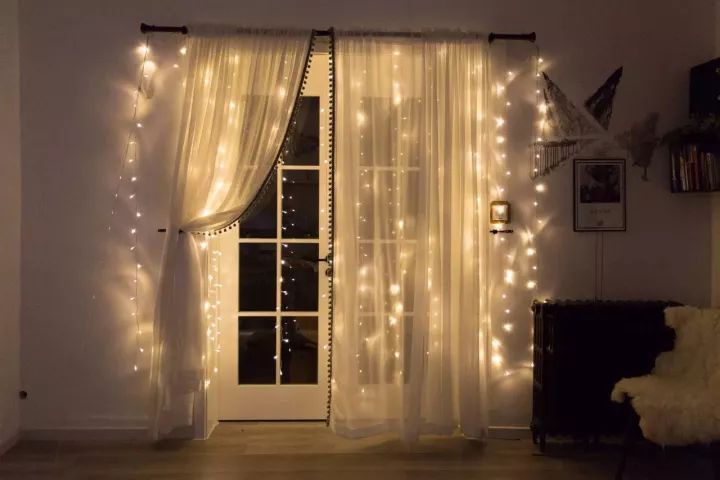 小串灯和纱帘是 “绝配”,搭配起来梦幻效果翻倍: