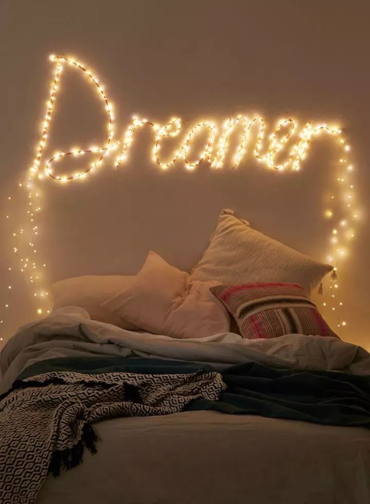 更有心思的话,可用串灯拼出自己和爱人的名字,挂在床头背景墙上 —— 比挂婚纱照更有个性,格调瞬间拉满,每次看到都觉得暖心。
