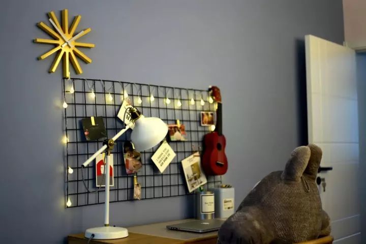 书桌 + 铁丝网:很多小户型业主会在书桌上方挂铁丝网,用来挂便签、照片 —— 在铁丝网上缠几圈小串灯,晚上看书、办公时,串灯亮起,既不影响用眼,又能让书桌区变成 “发光小角落”,氛围感十足;