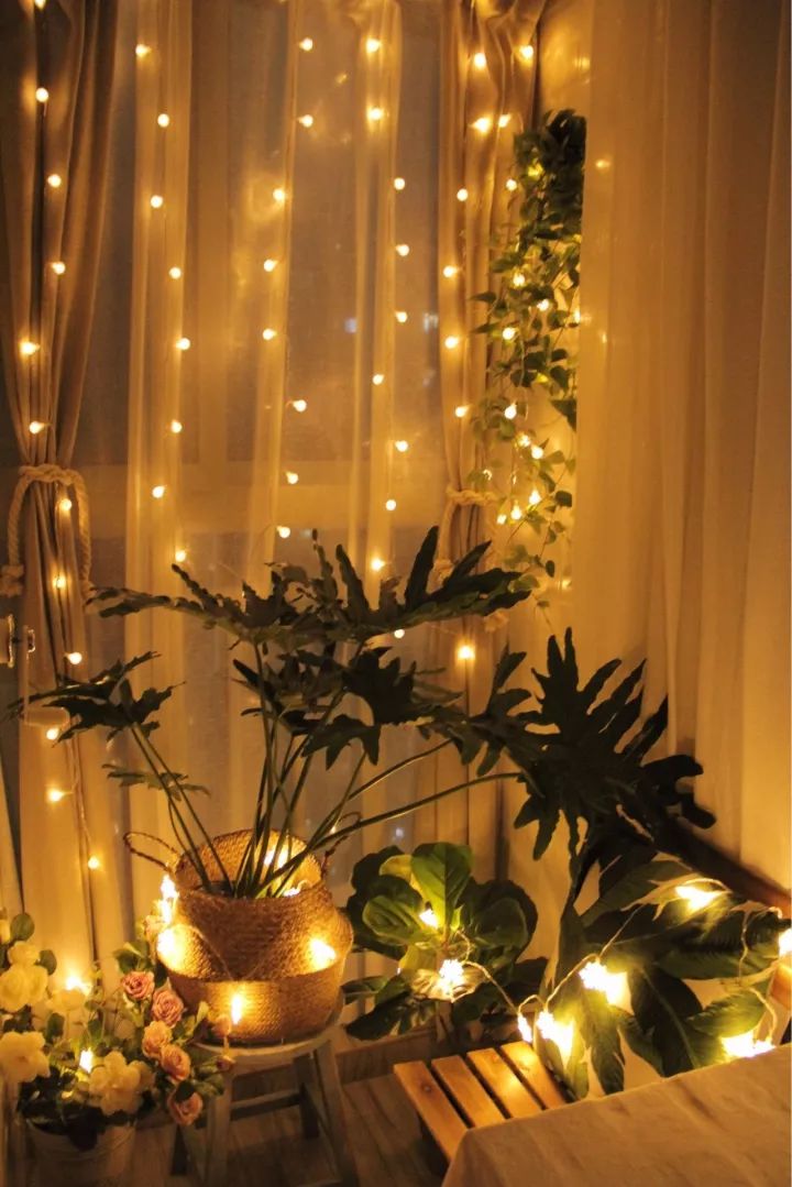 把串灯缠绕在阳台的绿植枝叶上,或沿着阳台护栏绕一圈 —— 晚上串灯亮起,暖光映着绿叶,仿佛把 “星空下的小花园” 搬进了家,坐在阳台喝茶、发呆,惬意又唯美。