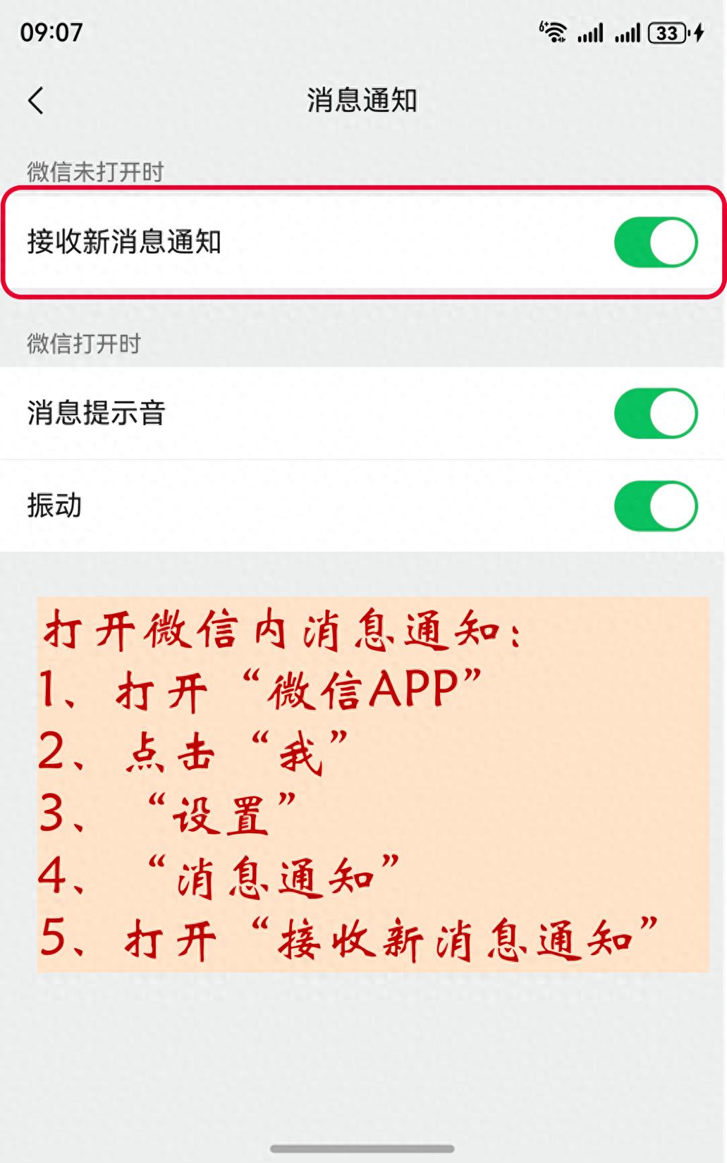 首先是应用层,这很简单也很关键,这能确保微信自己能够接收消息。路径是:【我】-【设置】-【消息通知】- 打开【接收新消息通知】,这是消息推送的第一道大门。