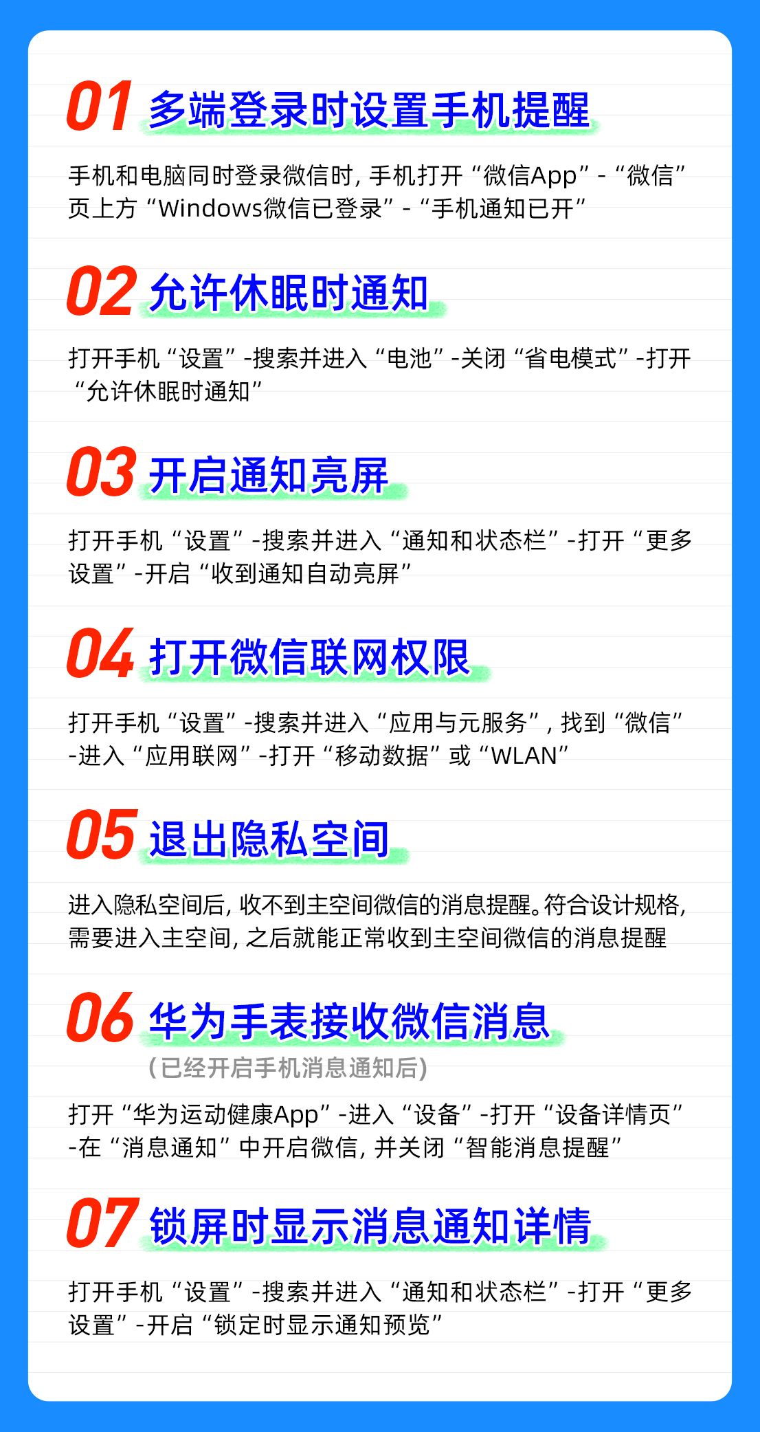 另外,诸如多端登录手机不提醒、不能亮屏通知、进入隐私空间后主空间微信不通知等问题,大家也可以在下面的图中找到解决方法。