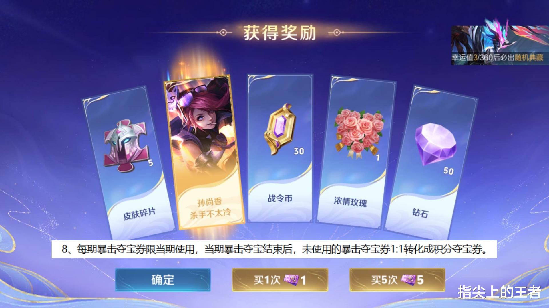 总结:暴击夺宝更多的是给土豪哥们凑皮肤用的,而不是我们这种一颗水晶要纠结换谁的玩家,真的不建议去抽这种完全随机的奖励,性价比太低了。