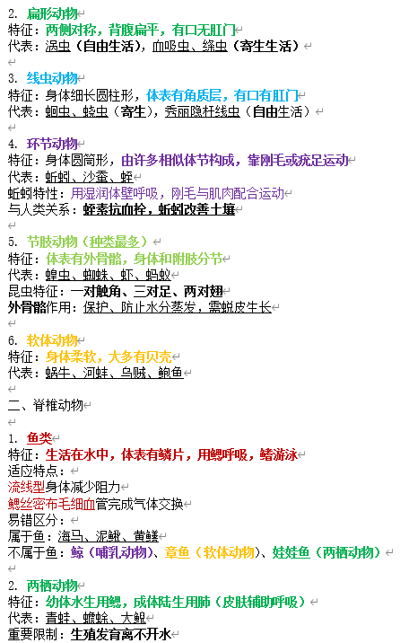 无脊椎动物:软体动物、节肢动物、线虫动物、环节动物、腔肠动物、扁形动物