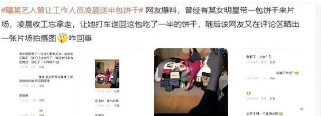 有网友称某女星拍戏时将吃剩的半包饼干遗忘片场,凌晨收工后竟要求工作人员专程送回。