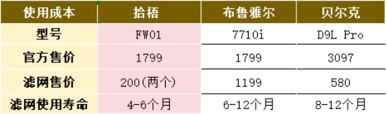 拾梧 FW01:整机售价1799元,滤网为双件装售价约200元,单次使用寿命4–6个月。以一年计算,更换2–3次即可,平均年度维护成本在几百元以内,整体投入最低,适合预算有限且需要高频使用的用户。