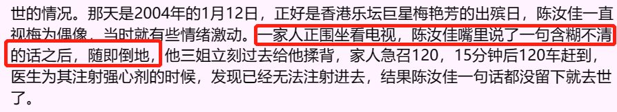 据陈汝佳的三姐透露,陈汝佳去世当天刚好是他的偶像梅艳芳出殡的日子,当时一家人坐在一起看电视,他突然倒地不起,即便救护车15分钟就赶到现场,但还是没能救回陈汝佳。