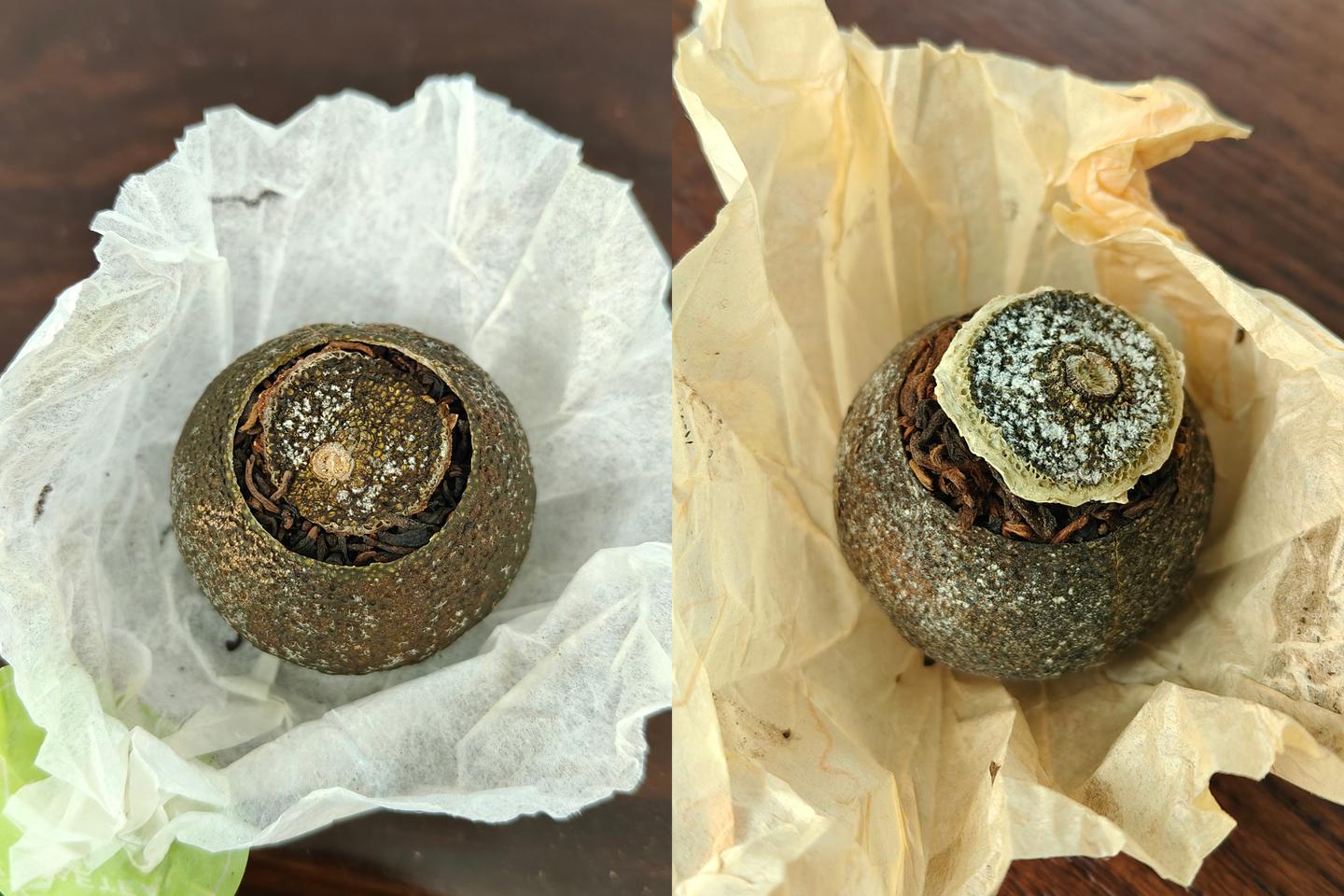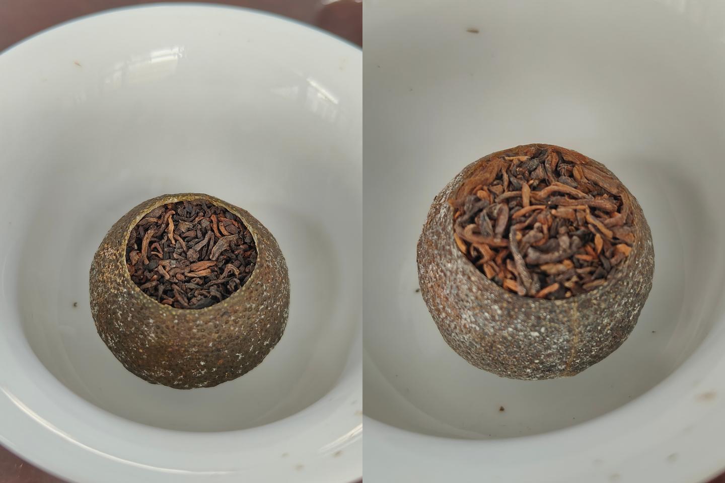 对比来看这两款的柑果个头都挺均匀饱满,“大益”家的柑果表皮白霜不算厚重,柑皮青亮有光泽,捏起来有韧性,揭开柑盖,里面填充的熟普条索紧实,闻起来是陈香混着淡淡的柑香,干净又不张扬。“柑外婆”的柑果表面白霜更自然,油包粒更加凸起,柑香馥郁,凑近闻是清甜的柑果本香,茶料填的很满,条索看起来也更匀整。