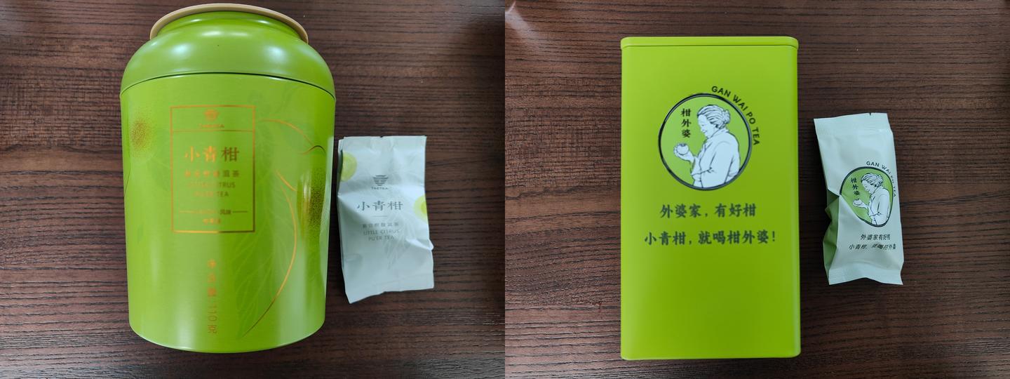 这两款的包装都是看着就清新的嫩绿色,大益的偏暗一点,柑外婆会更亮一些,密封性都不错,每一颗小青柑也都有小包装。