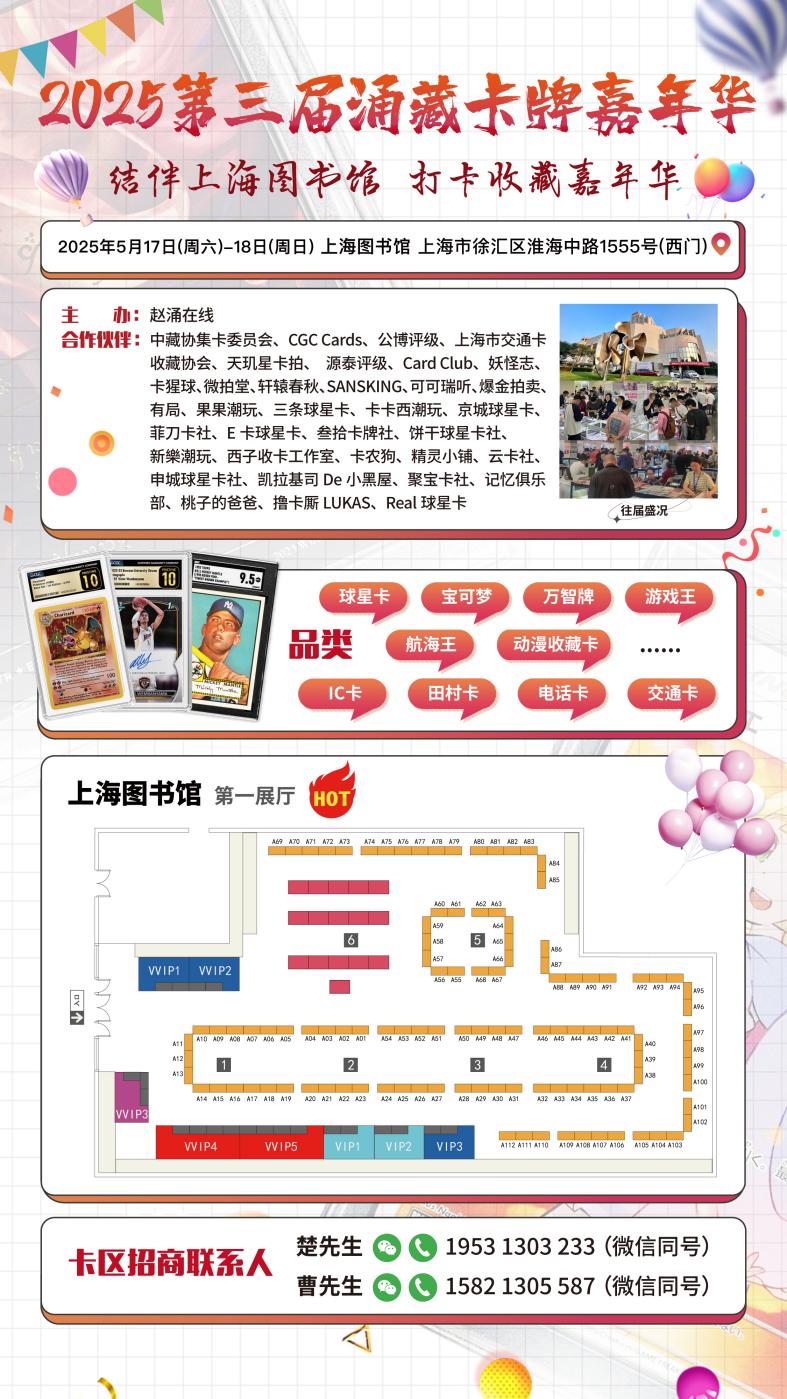 在球星卡文化日益兴起的背景下,2025年5月17日至5月18日,在上海图书馆举办的第三届涌藏卡展无疑是一场球星卡爱好者的狂欢盛宴。此次展览将汇聚超过110家展商,他们来自全国各地,涵盖了球星卡卡社、TCG商家、出品方以及评级公司等多个领域。