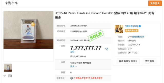 球星卡的二级市场,作为球迷和投资者进行交易的平台,其价格波动犹如坐过山车一般,令人惊叹。一些稀有卡片甚至能在拍卖市场上拍出天价,成为收藏界和投资界的焦点。例如,2022年,一张米奇·曼托的棒球卡以1260万美元的天价成交,一举打破了体育藏品拍卖纪录,让全球收藏界为之侧目。在国内,也曾出现一张C罗的球星卡在卡淘App上拍卖出777万天价(后澄清为误拍)的乌龙事件,但这也从侧面反映出球星卡二级市场的火热程度。
