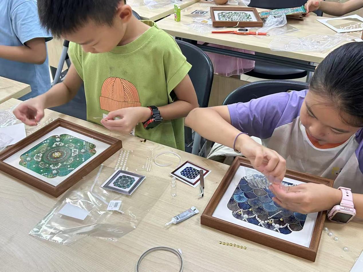 这种在动手中感悟、在制作中学习的模式贯穿活动始终。从南湖红船航模的精准拼装,到玲珑鱼灯的精巧制作,再到宋锦珍珠相框画的创意设计,每一件作品都成为传统文化与价值引领的生动载体。一位正在拼接红船模型的孩子分享道:“原来‘红船精神’就藏在这一板一木的拼装中,我要把它放在书桌上,时时看着。”