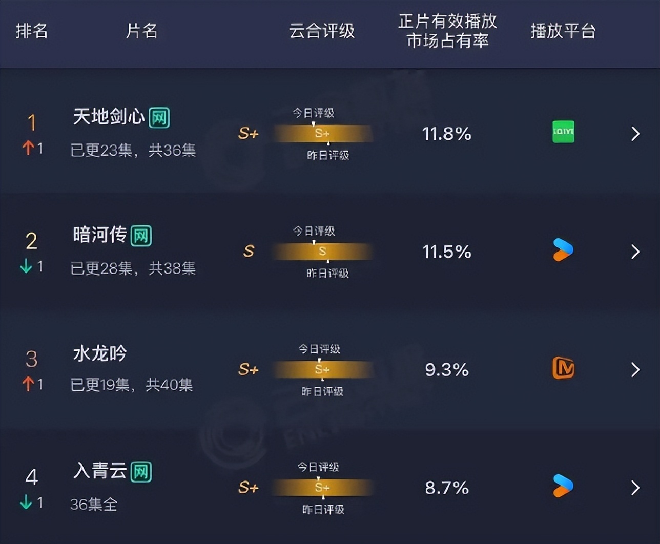 《天地剑心》是“狐妖小红娘”系列,从整体上看,三部“狐妖小红娘”系列电视剧,取得的成绩都理想,目前,这部剧的正片有效播放市场占有率已经达到11.8%,成功登顶,但与《暗河传》和《水龙吟》相差并不大。