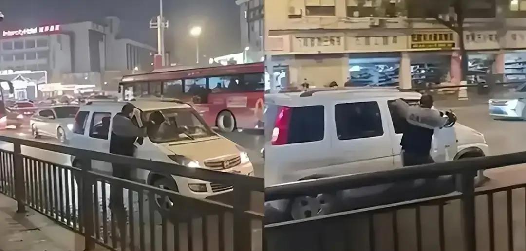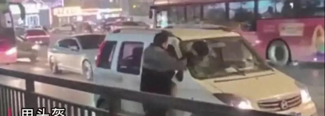 然而,尽管男子行动危险,车子却并没有停下来。而他的老婆,也稳稳坐在车里,任凭他在边上砸玻璃、骂脏话,都不予理会。