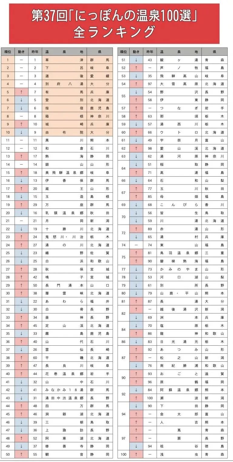 加上排名的区域分化,第一名温泉在群马,第二名在岐阜,第三名在爱媛,想要体验温泉之旅,就容易出现一个情况,不好计划自己的行程。
