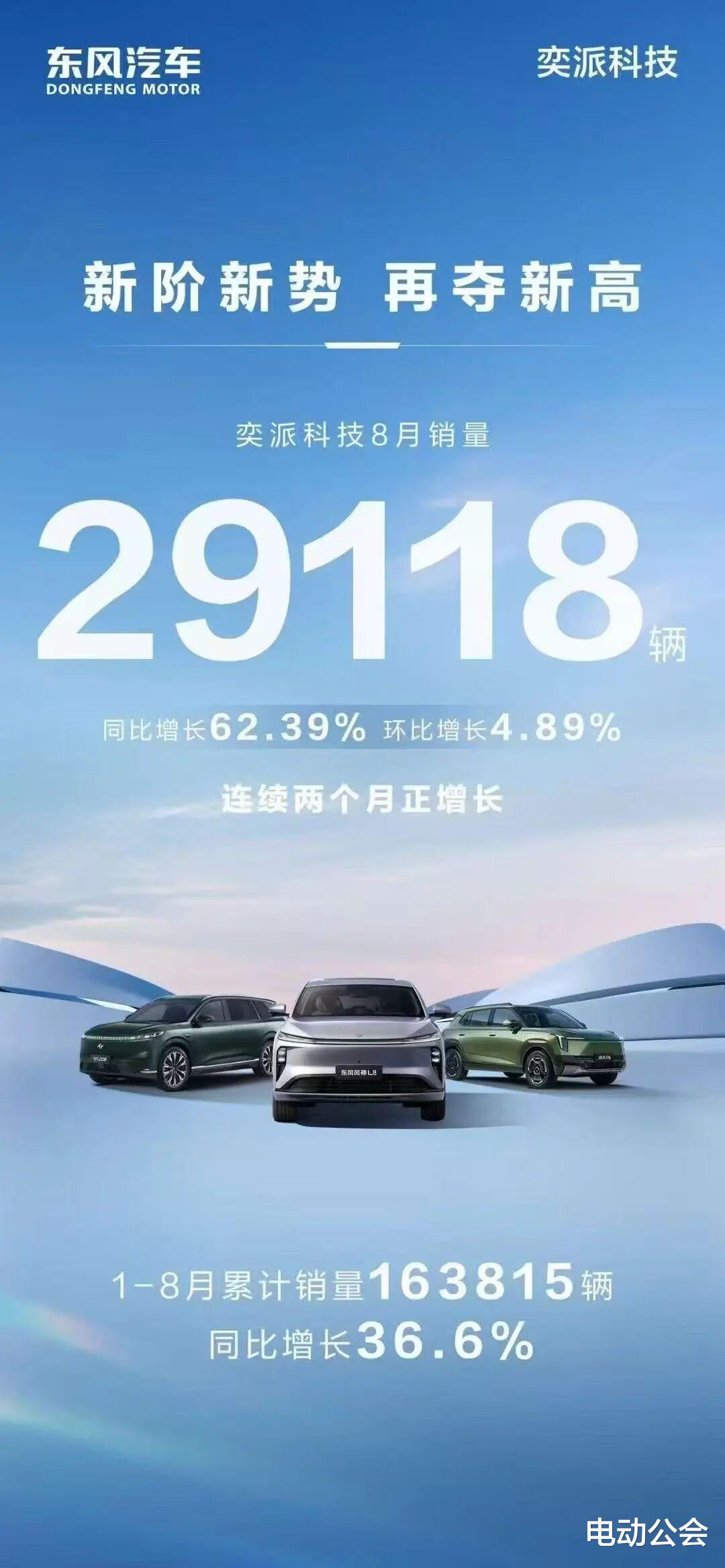 奕派科技8月销量29118辆,同比增长62.39%、环比增长4.89%,连续两个月增长。1-8月累计销量163815辆,同比增长36.6%。