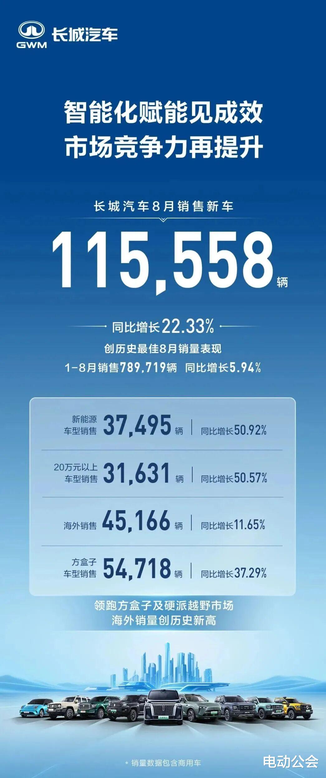 长城汽车8月新能源销量创新高,达37495辆,同比增长50.92%,远超行业增速。其中,WEY品牌表现突出,销量激增167.51%,哈弗和欧拉品牌也稳步增长。