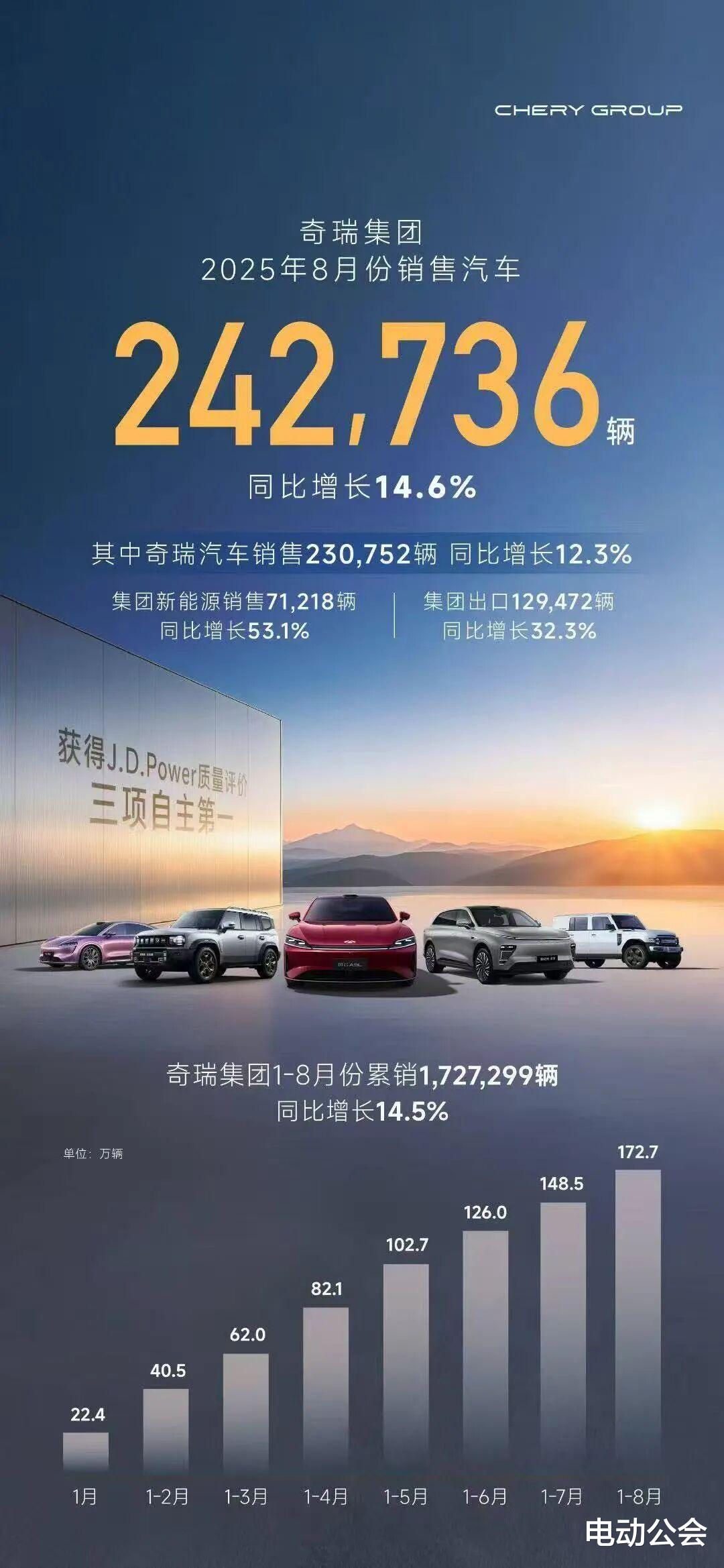 奇瑞集团8月份销售汽车242736辆,同比增长14.6%。其中,奇瑞集团销售新能源汽车71218辆,同比增长53.1%。今年1-8月新能源累计销量35.94万辆,同比增长98.6%