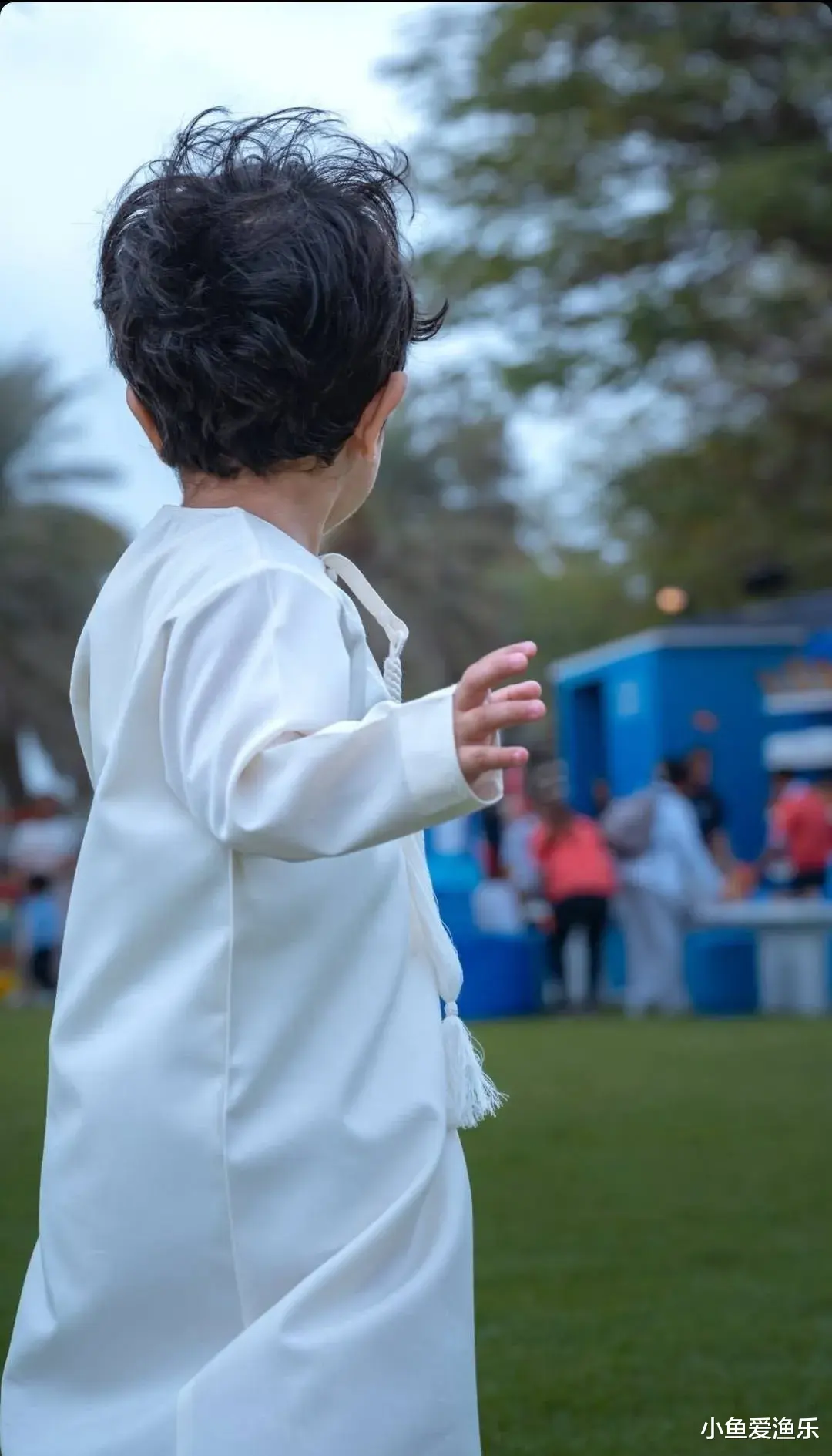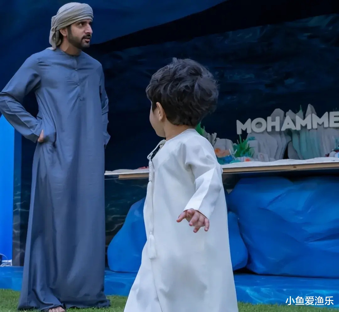最吸引眼球的是谢克哈特意拍摄的一张照片:小王子站在草坪上,仰视着不远处身着蓝色长袍、满脸笑意的父亲哈曼丹。哈曼丹的身后,蓝色庆祝台上摆放着玩具模型,上面写着"Mohammed"——小王子的名字"默罕默德"。