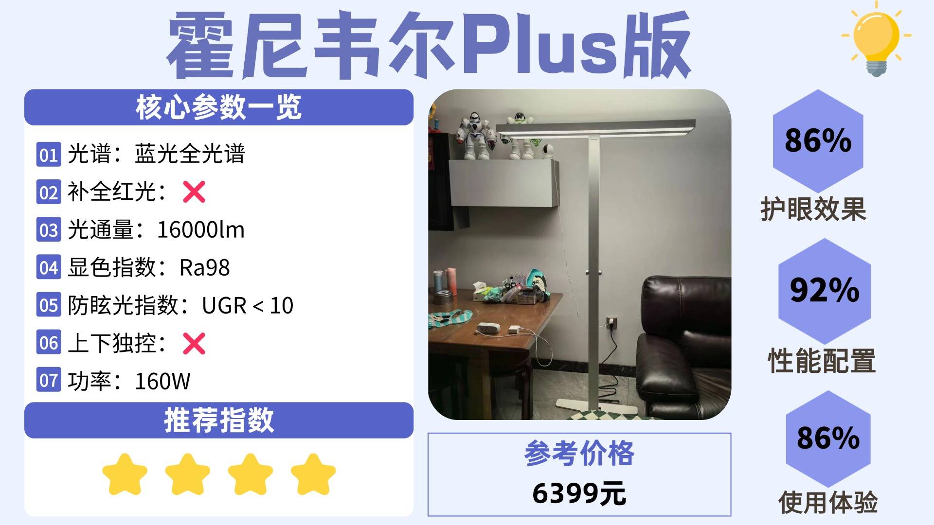 护眼大路灯第二名:霍尼韦尔Plus版;隔断式双发光面双边发光,呈现出来的光线足以照亮20㎡区域。