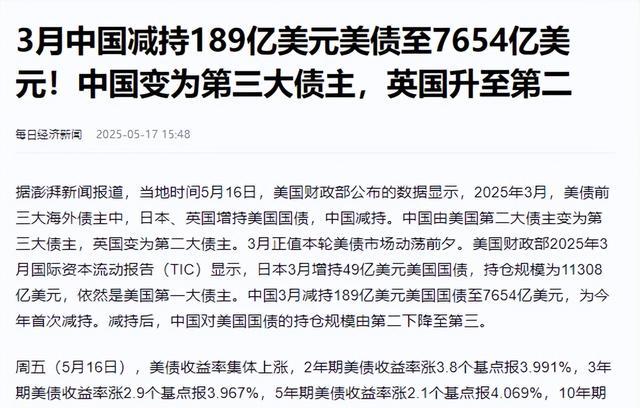 在经济领域,中国对美债的持仓出现了明显变化,2025 年 3 月,中方再度抛售 189 亿美债,持仓降至 7654 亿美元,排名也跌至第三。