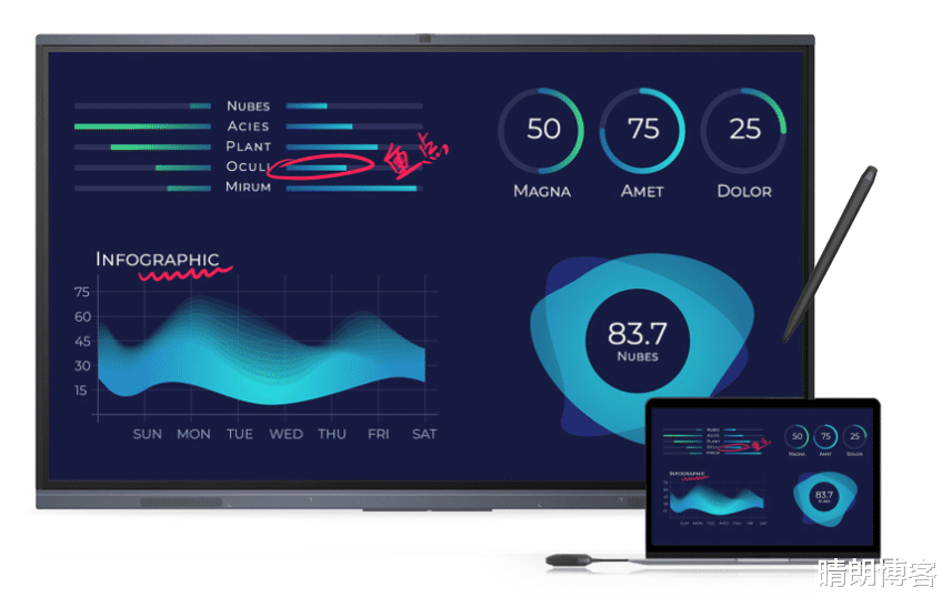 九颐数科智能会议平板是投影仪、投影屏、书写白板、音频、电视、电脑、远程视频会议的结合,融合了六机合一的6种设备的所有功能,它还具有以下类型的应用。