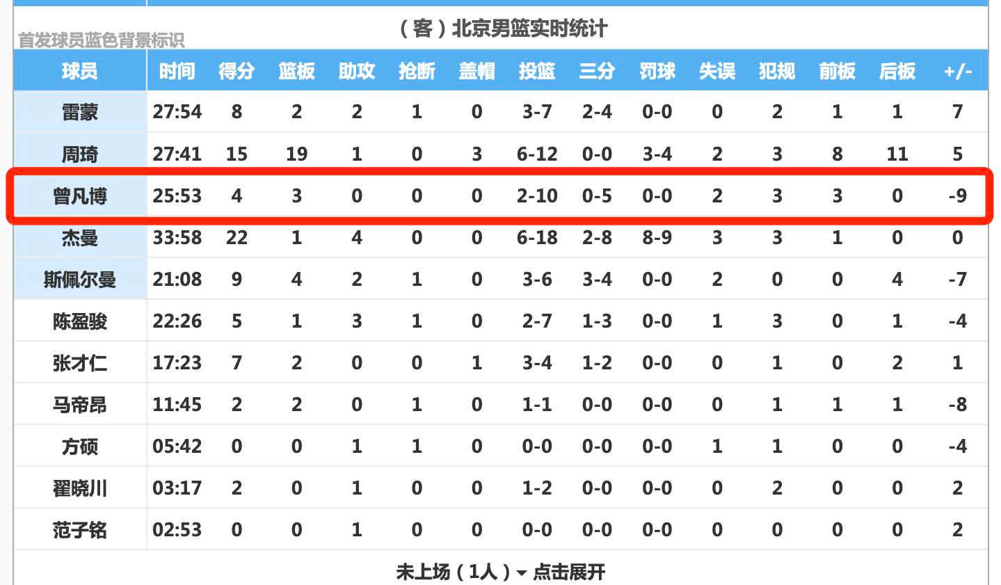 本场比赛许利民给足了他出场时间了,面对强队依旧是拉胯,打弱队虐虐菜还可以,因为曾凡博的对抗能力差,不知道接下来曾凡博能不能回状态,提升一下能力。
