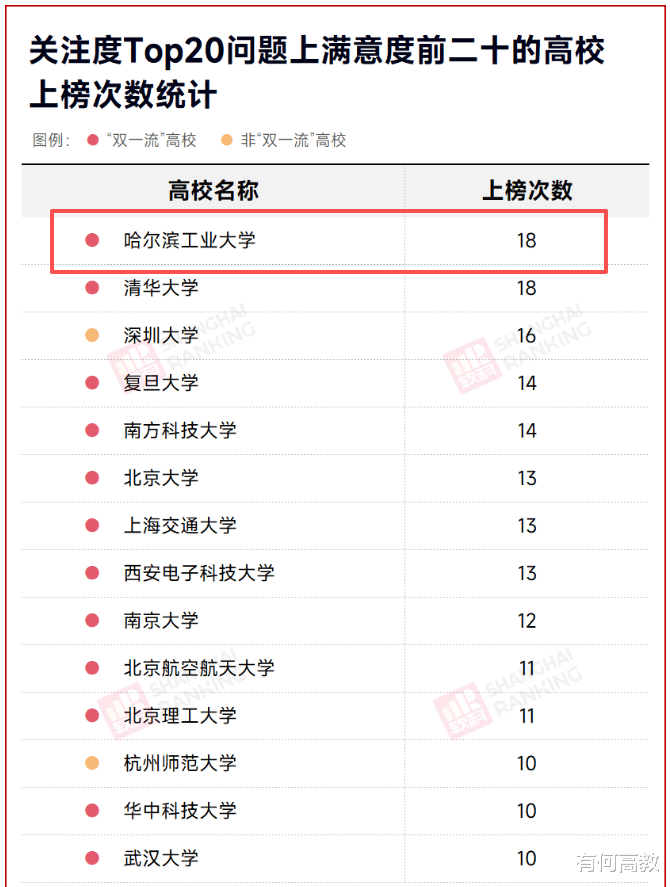 如果让学生们来投票“神仙大学”,会是哪一所呢?宿舍WiFi全覆盖、24小时水电不断、自习室多环境好、食堂便宜又美味……软科对本科生最关注的20个问题进行调查,结果项目满意度反复的是哈尔滨工业大学,以18次上榜与清华大学并列第一。这份成绩单让 “神仙大学” 的称号实至名归。