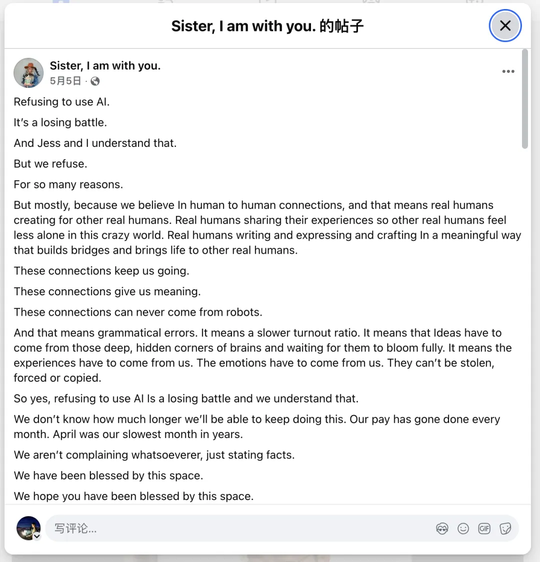作者丨山茶编辑|钱江Refusing to use AI, It’s a losing battle.(拒绝使用人工智能,即便这场战役注定失败。)这是五月份,Jess Johnston(杰斯·约翰斯顿)和Amy Weatherly(埃米·韦瑟利)在她们共同的Facebook账户上发布的内容。Jess 和 Amy 是美国知名作家,社交媒体上拥有近200万粉丝,两人合著的书籍更是在2022年被《华尔街日报》评为年度畅销书。Jess 和 Amy 提到:虽然拒绝使用AI这种坚持注定失败,虽然每个月的收入都在因此下降,但我们仍然认为“真实的人,以有意义的方式书写,表达和创作带来的东西,是AI永远也无法赋予的。”