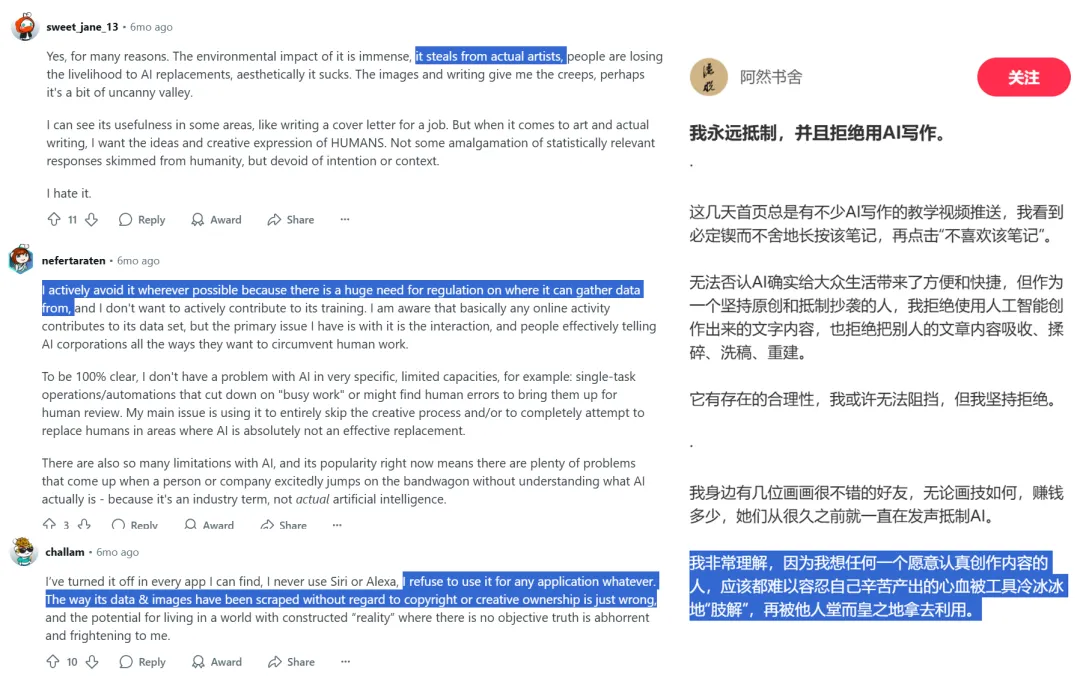 ▲Jess和Amy的社交媒体截图但这样的行为显然与今天正在发生的事情格格不入,AI正在进入人们生活的方方面面,从上海外滩的高级写字楼,到四川三线城市的菜市场,每天都有无数人在和AI发生着无数次交互。这是属于AI时代的狂热,新神崛起。按常理而言,这种背景下「拒绝使用AI」应该是一种绝对的小众行为。但出乎意料的是,在Jess和Amy帖子的评论区,许多人向她们表达了支持,并表示自己也同样在抵制AI。甚至在国内,抱有同样想法的人也不在少数。如果我们在小红书上搜索关键词,就会看到许多相关的帖子,他们高喊拒绝AI的口号,细数使用AI的弊端,并坚持用一种传统的方式进行创作。拒绝使用AI似乎并不是一个小众行为。那么,对于从小学习近代史的中国人而言,大家其实比谁都明白“落后就要挨打”的道理,也比大多数人更愿意接受新事物和新技术。但即便是这种情况下,当AI明确成为「未来」的代名词之后,为什么仍然会有相当一部分人固执的拒绝使用AI,甚至宁愿被贴上保守、固执、传统的标签呢?这些拒绝使用AI的人,他们真的仅仅只是现代意义上的卢德分子吗?在AI浪潮中,拒绝者的坚持到底是迟钝的顽固,还是对人性与创造力的捍卫?