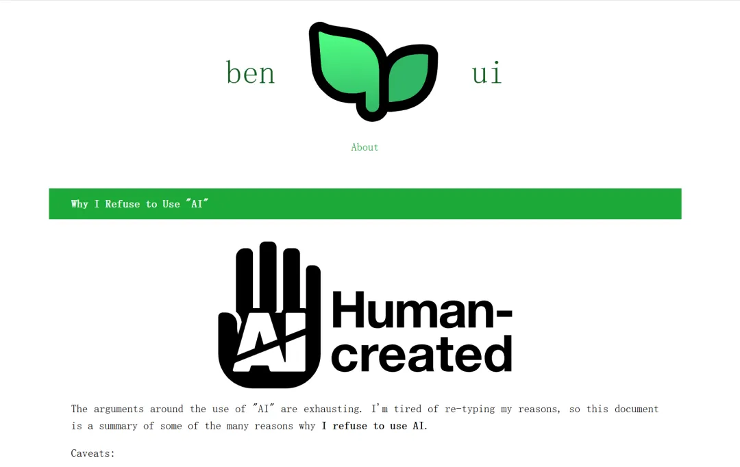 ▲美国编剧工会成员在洛杉矶福克斯工作室外举行罢工 美联社拍摄好莱坞的编剧和演员们担心,自己剧本、肖像、声音和表演数据都会被用作AI训练,他们自己不仅无法从中获得报酬,未来还可能被AI生成的内容所替代。于是,他们强调人类创作的价值和不可替代性,并对影视行业使用AI提出了一系列限制。比如要求生成式AI只应作为辅助工具,绝不能替代人类编剧,且禁止使用AI生成剧本;比如制片方如果AI合成的演员必须告诉工会,如果使用演员的数字肖像必须征得演员同意,且支付相关报酬......这场大罢工被认为是全球第一次针对生成式AI在工作场所使用而进行的大型劳资纠纷,并在全球范围内掀起了关于人类劳动和AI创作的广泛讨论。但这场讨论并没有持续多久,一百多天后,随着工会和相关企业达成协议,编剧和演员们复工,关于人类创作价值的讨论也随之戛然而止。AI的技术开始突飞猛进,人们开始重新沉浸到AI带来的巨大历史机遇当中,而逐渐忽略了当初迫在眉睫的问题。但并不是每个人都在获得利益之后便丢弃了对「拒绝AI」的坚持。比如来自英国的虚幻引擎UI程序员Ben,他就在自己的博客首页郑重的发布了一项关于“我为什么拒绝使用AI”的声明。