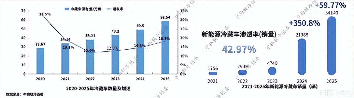 中国物流与采购联合会相关数据显示,2025年,冷藏车保有量预计达58.54万辆,较2020年增长104.19%。其中,新能源冷藏车销量预计约34140辆、同比增长59.77%,占冷藏车总销量的42.97%;“十四五”期间,累计销售6.4万多辆,年均增速134.31%!