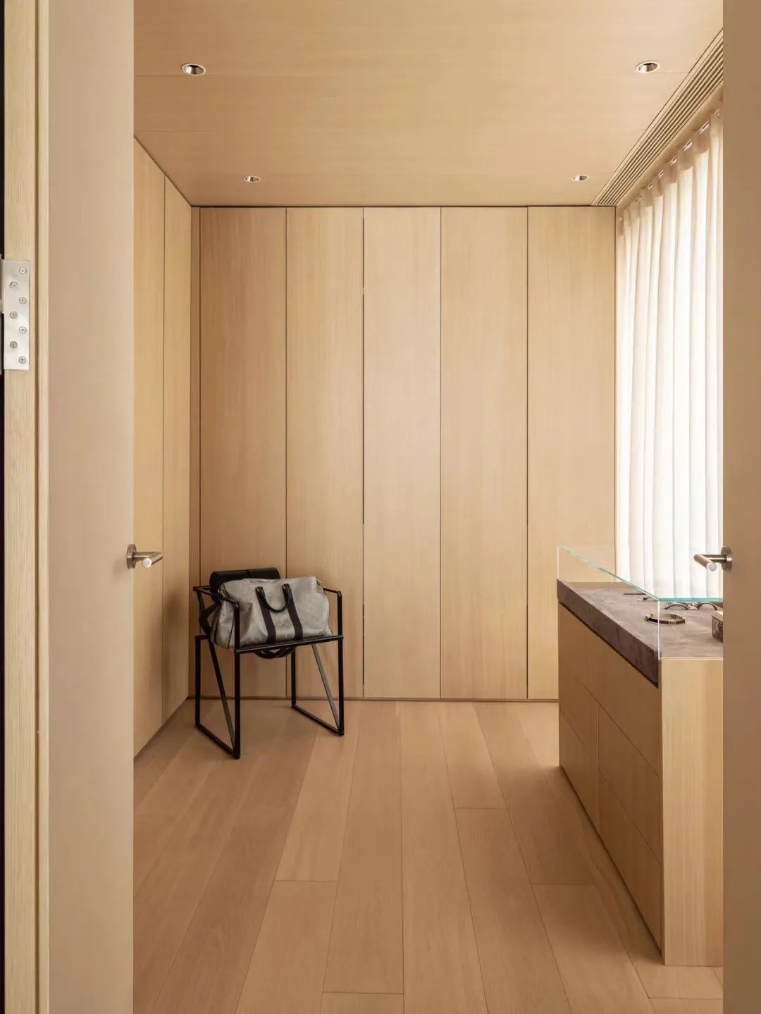 若主卧空间宽敞,光摆放一张床着实浪费,我们可以利用一面墙体将睡眠区、衣帽间或者办公区分开设计。
