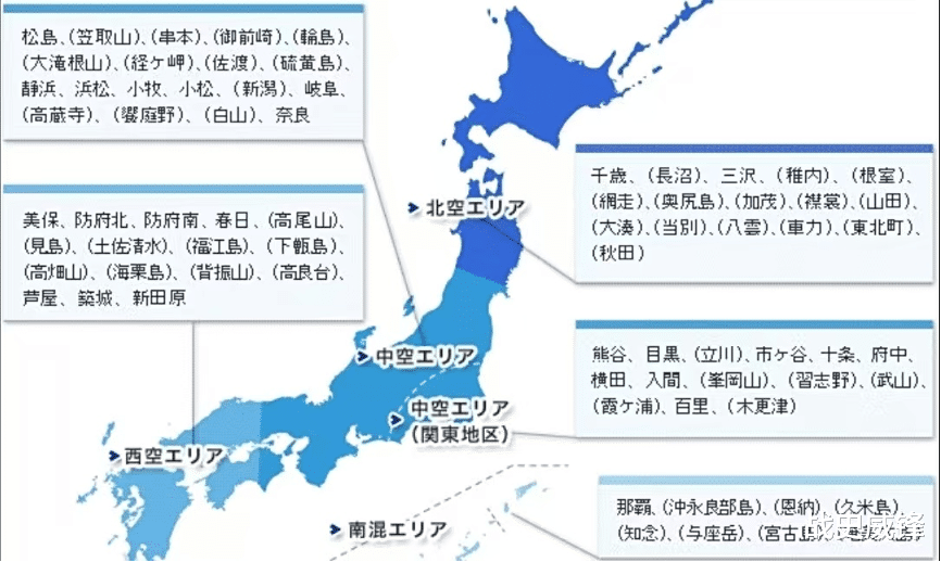 除此之外,日本航空自卫队目前共有73个军事基地,主要分布在北海道地区(10个)、东北地区(9个)、关东地区(16个)、中部地区(10个)、关西地区(4个)、四国地区(6个)、九州地区(12个)、以及“中国琉球群岛”地区(6个)国耻勿忘。