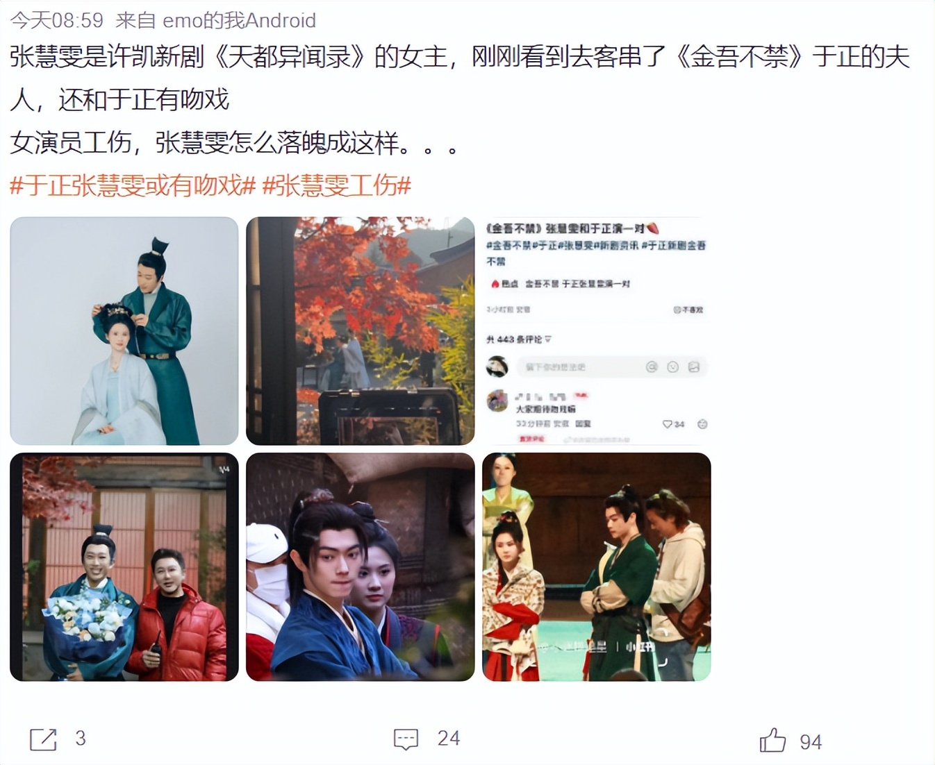 看到张慧雯搭档于正,很多网友都想到《侠客行不通》,在这部剧中,徐志胜是男主,官宣主演阵容后,女主“范静祎”,立即获得关注,最让大家没想到的是,“于正张慧雯或有吻戏”话题登上热搜,网友们忍不住调侃:爱你老己,只有于正听进去了。