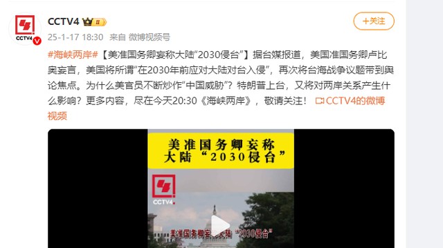 CCTV4——美准国务卿妄称大陆“2030侵台”