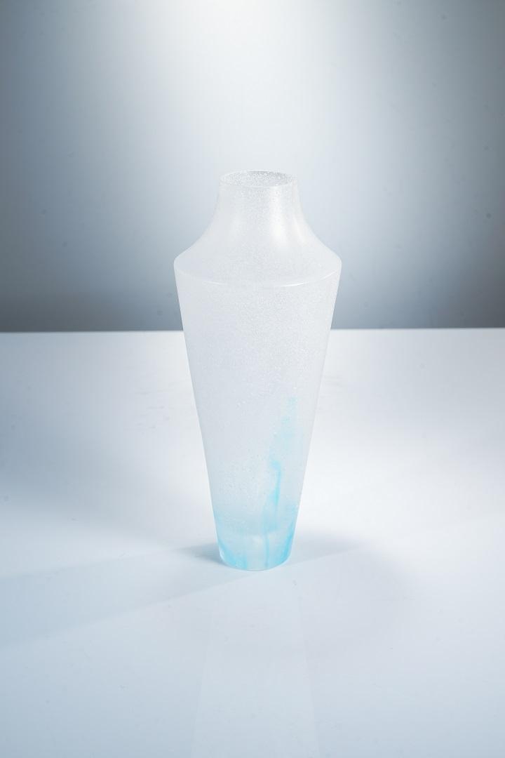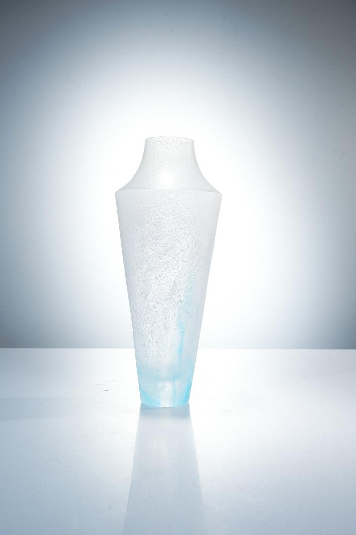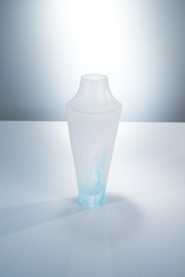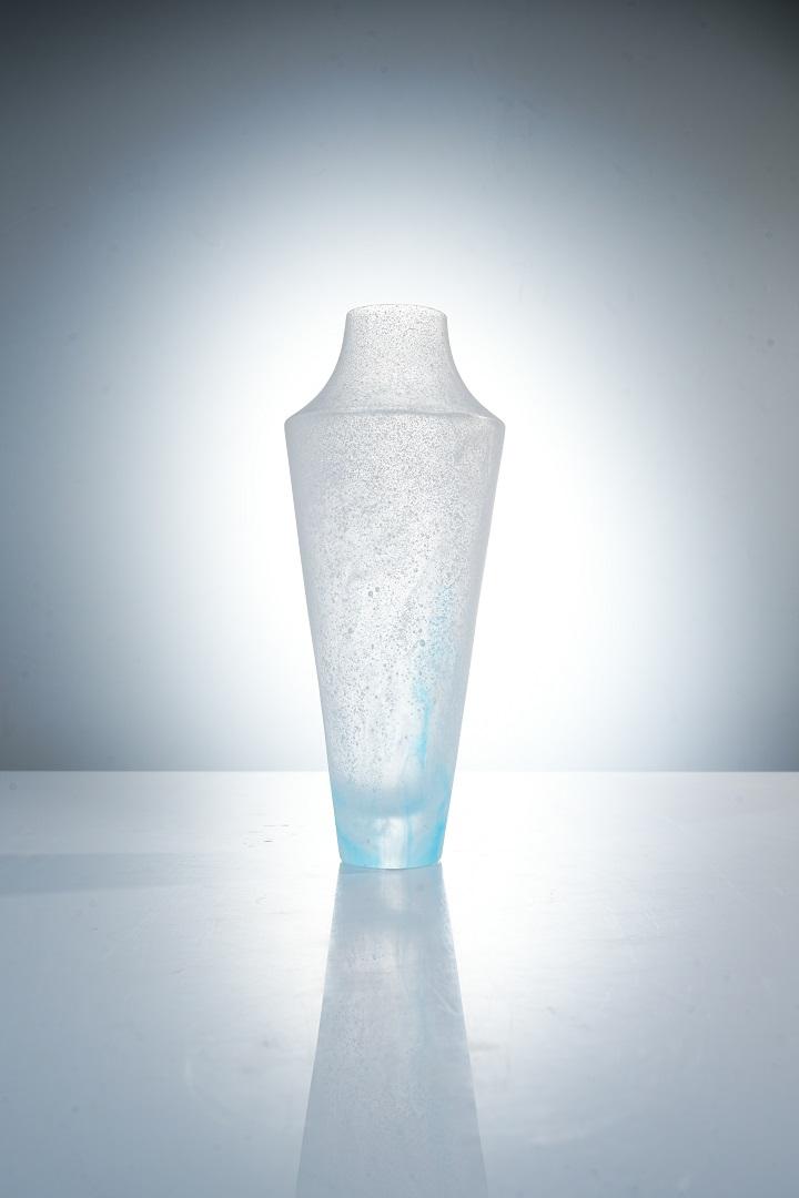 那天,阳光透过工厂的天窗,洒在琳琅满目的琉璃作品上,光影交织,如梦如幻。我的目光被一个角落的一抹幽蓝吸引,走近一看,竟是一只清霁花瓶。它静静地立在展架上,宛如一位遗世独立的佳人,散发着清冷而迷人的气息。