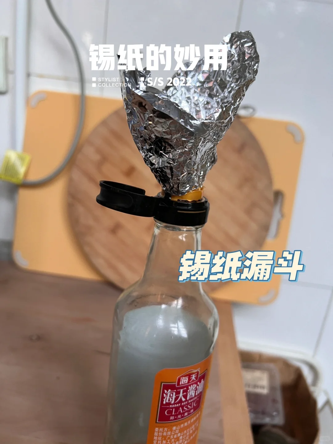 家里没有漏斗,该怎样分装液体呢?比如在分装油、醋、酱油的时候,怎么才能不会倒洒了?其实不需要漏斗,只要家里有锡纸就可以了,