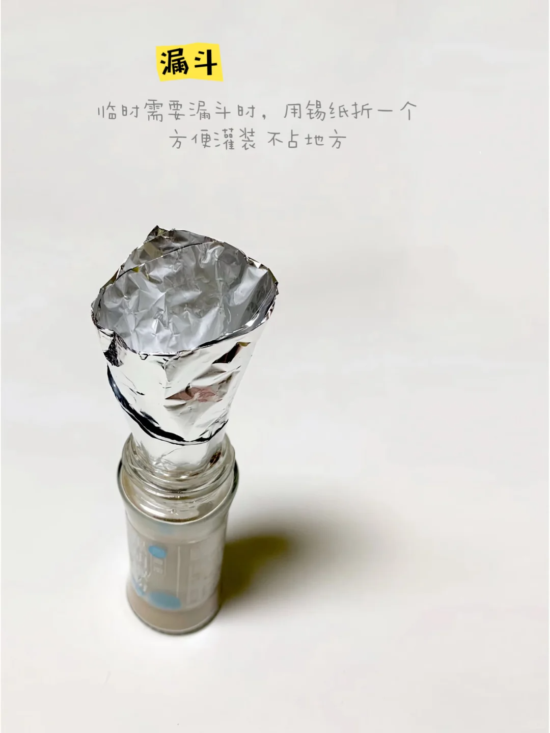 把锡纸折叠成漏斗的形状就可以代替漏斗来使用,分装液体也不会撒,用完之后还能再继续用。