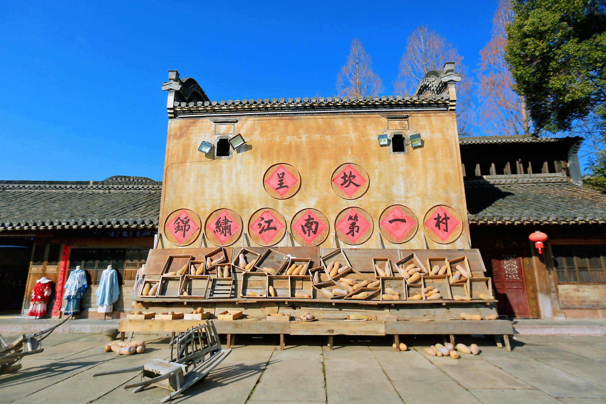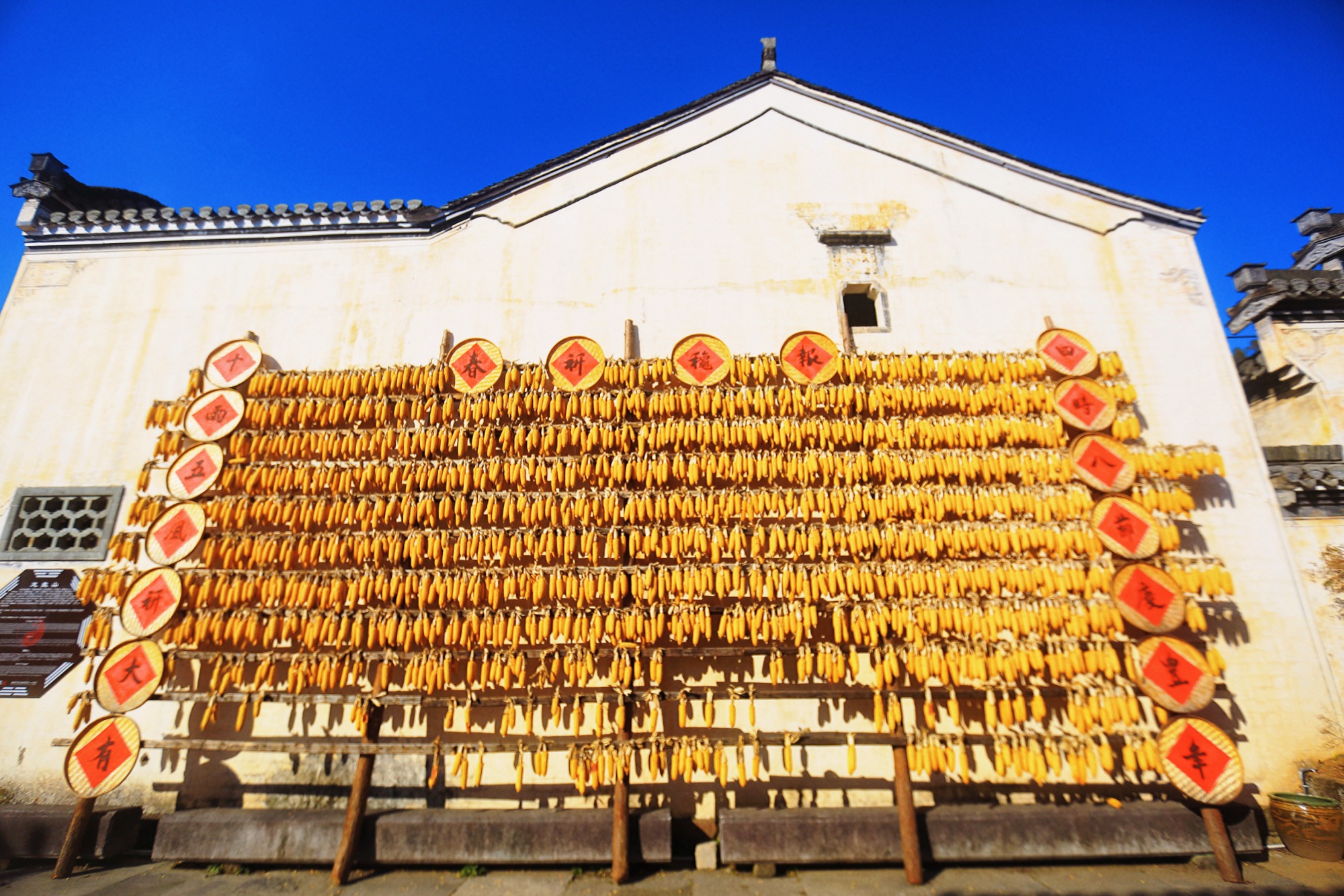 此时走在村中,依然可以看到晒秋后留下的痕迹,墙壁上红纸黑字写着“呈坎锦绣江南第一村”,堆叠的木箱中农作物错落摆放,金黄色的玉米和土色墙壁融合成令人欣喜的丰收色调,充满生活气息。