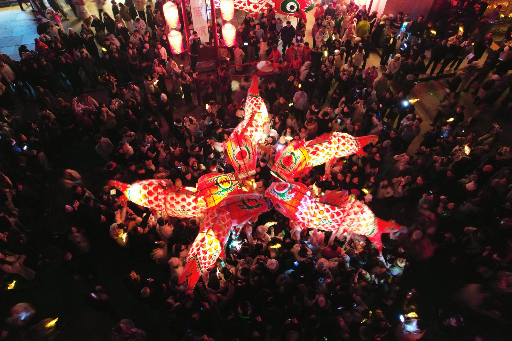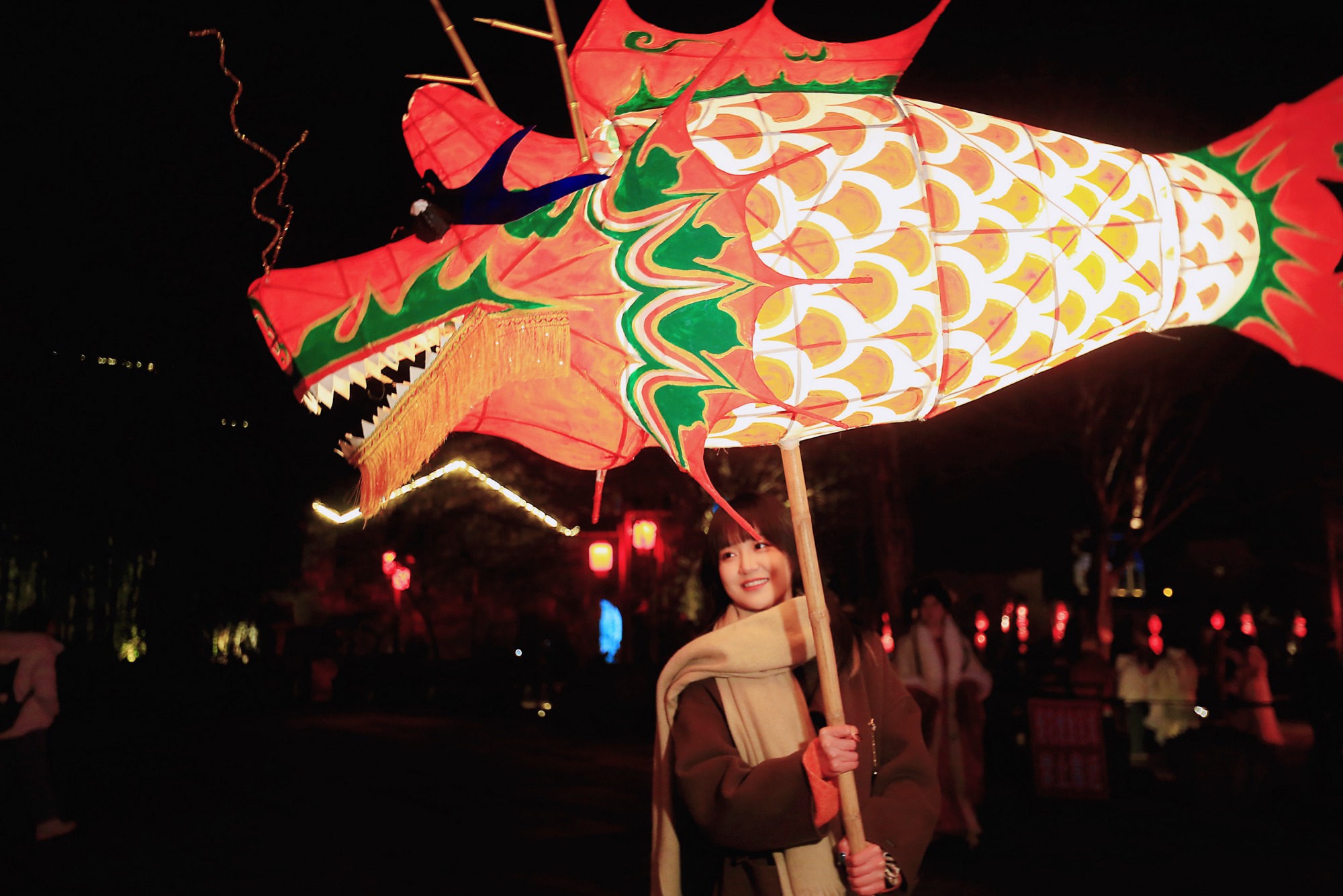 夜幕低垂,村子反而更加热闹起来,灯笼高悬,美丽的鱼灯在人群中游动。这些鱼灯全部为村民亲手制作,红色灯身里是黄色灯光,鳞片用彩纸粘贴,眼睛栩栩如生。此时的呈坎如深蓝夜空下苏醒的巨鲤,在粉墙黛瓦间摆尾生辉。