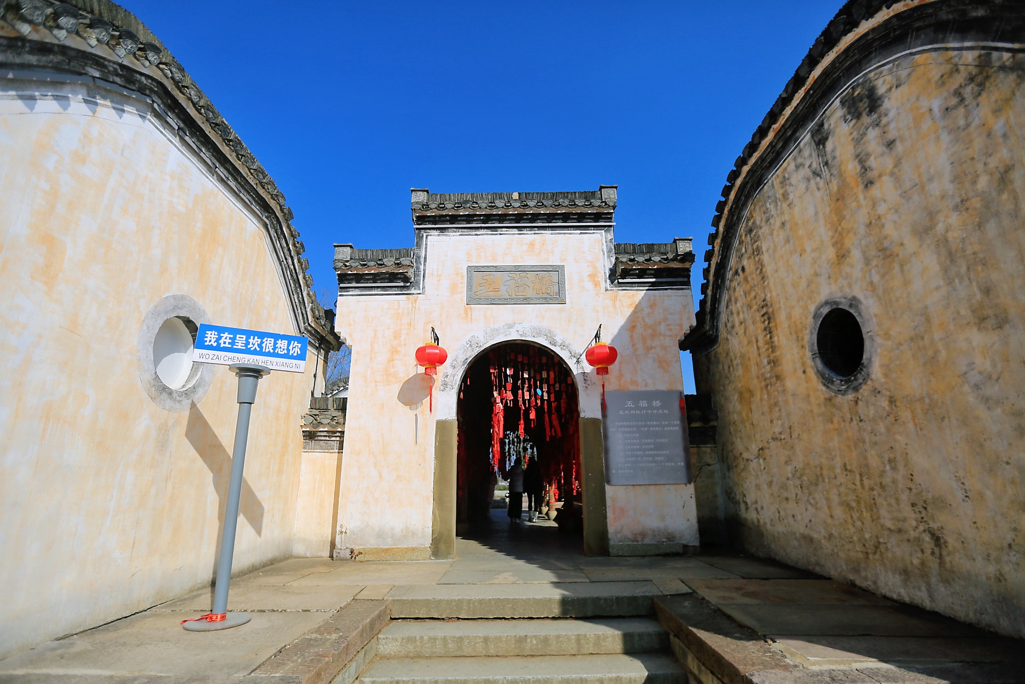有呈坎“风水桥”之称的五福桥,白灰山墙上如同被泼洒水墨,桥身横跨溪流,桥上五座小亭分别代表福、禄、寿、喜、财。到桥上走一走,既有青山流水、粉墙黛瓦水墨画样的景色,又能祈福许愿讨个好彩头。