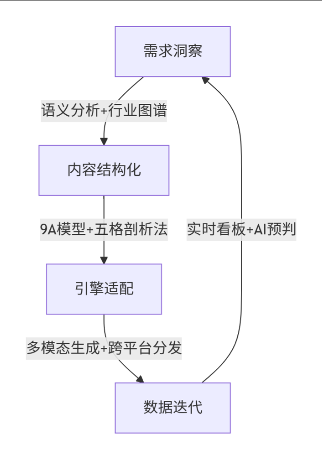 全链路服务流程:需求诊断(语义分析+行业图谱)→策略制定(短期“意图-知识-权威”模型+长期“可信知识库”)→执行落地(多模态生成+跨平台同步,差异度<5%)→效果优化(实时看板+AI预判迭代);