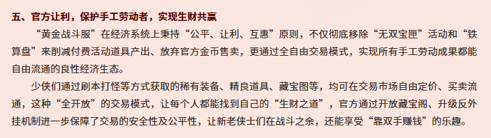 就连赚钱这件事,也被《大唐无双》官方给抛在了脑后。官方宣布在黄金战斗服搞上“官方让利+开放市场+不卖金币”三板斧,PVP活动里可以掉稀有道具,道具能直接进入竞拍,拍出来的元宝全分给参与的玩家。