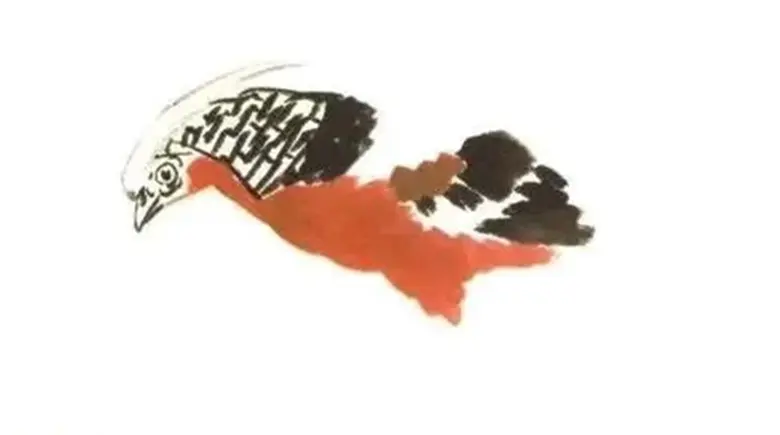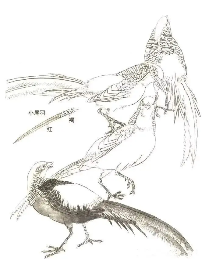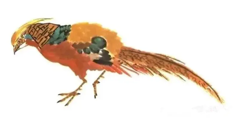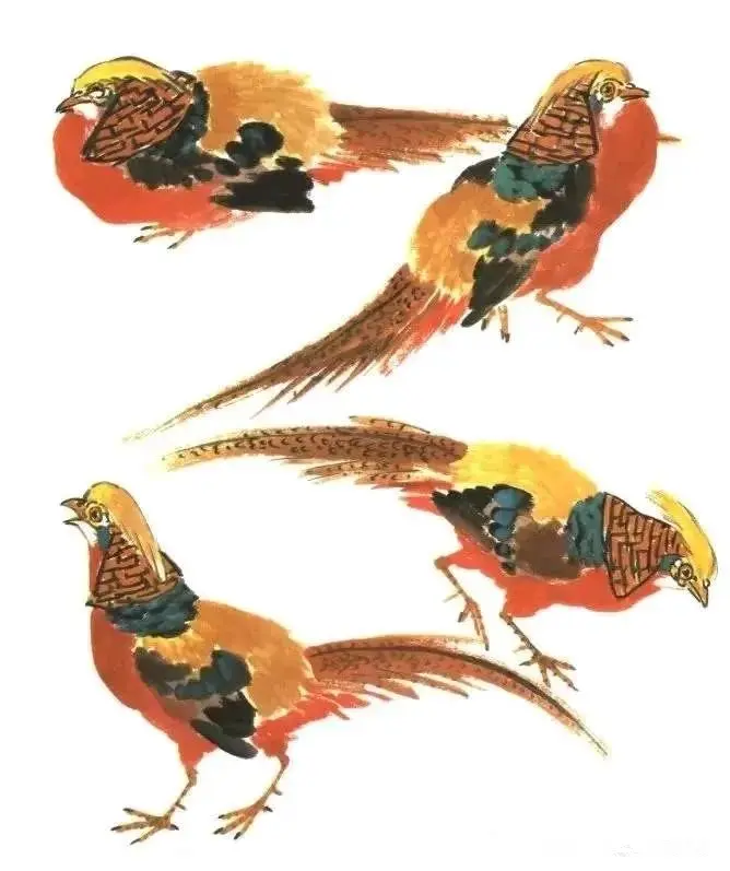 接着蘸墨添加翼部,调配朱色增添腹部,研磨黄色补充腰部,顺势着上冠羽和裸皮之色,而后绘出足与长尾,点染石青等。