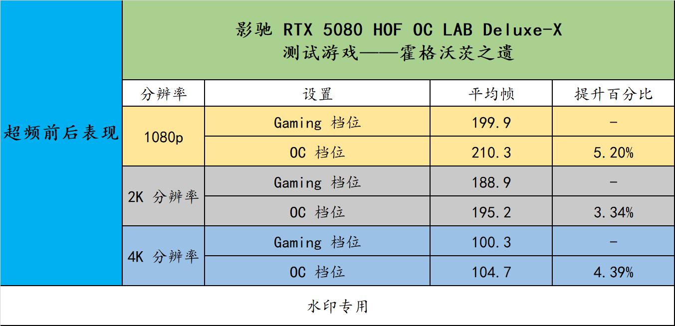 ▲ 《霍格沃茨之遗》在显卡超频前后性能提升实测。采用同一可重复的游戏场景,记录过程 FPS,并求取平均值。