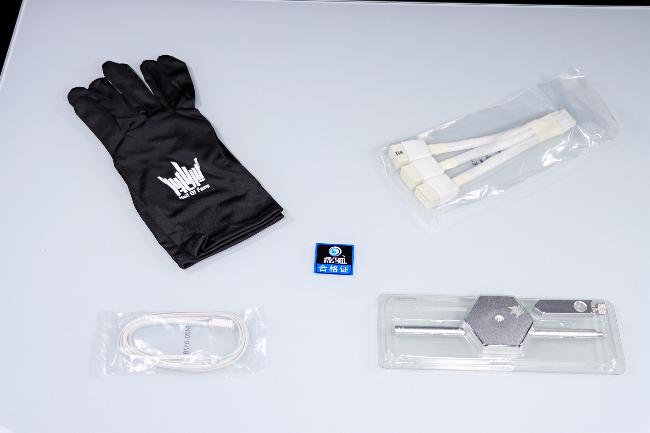 ▲ 配件包里有手套、3 * PCIe 8pin 转 +12V-2x6 电源线、合格证、ARGB 信号线,以及显卡支撑架。