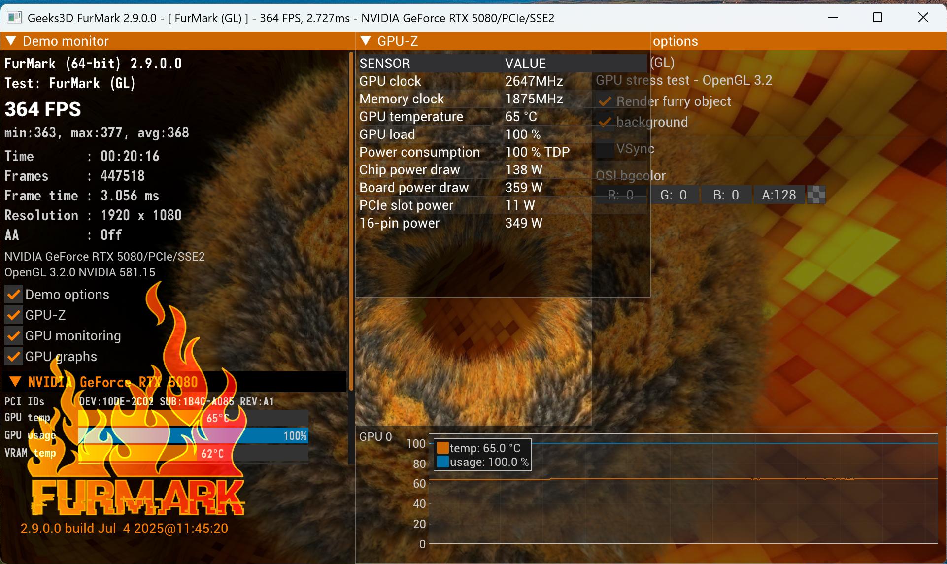 ▲ 影驰 名人堂 GeForce RTX 5080 HOF OC LAB Deluxe-X 的 Furmark 满载 20 分钟结果图。GPU 满载温度维持在 65 ℃,显卡满载功耗在 360W 左右。而且这个温度还是超频模式下的功耗与温度,日常只会比这个更低。