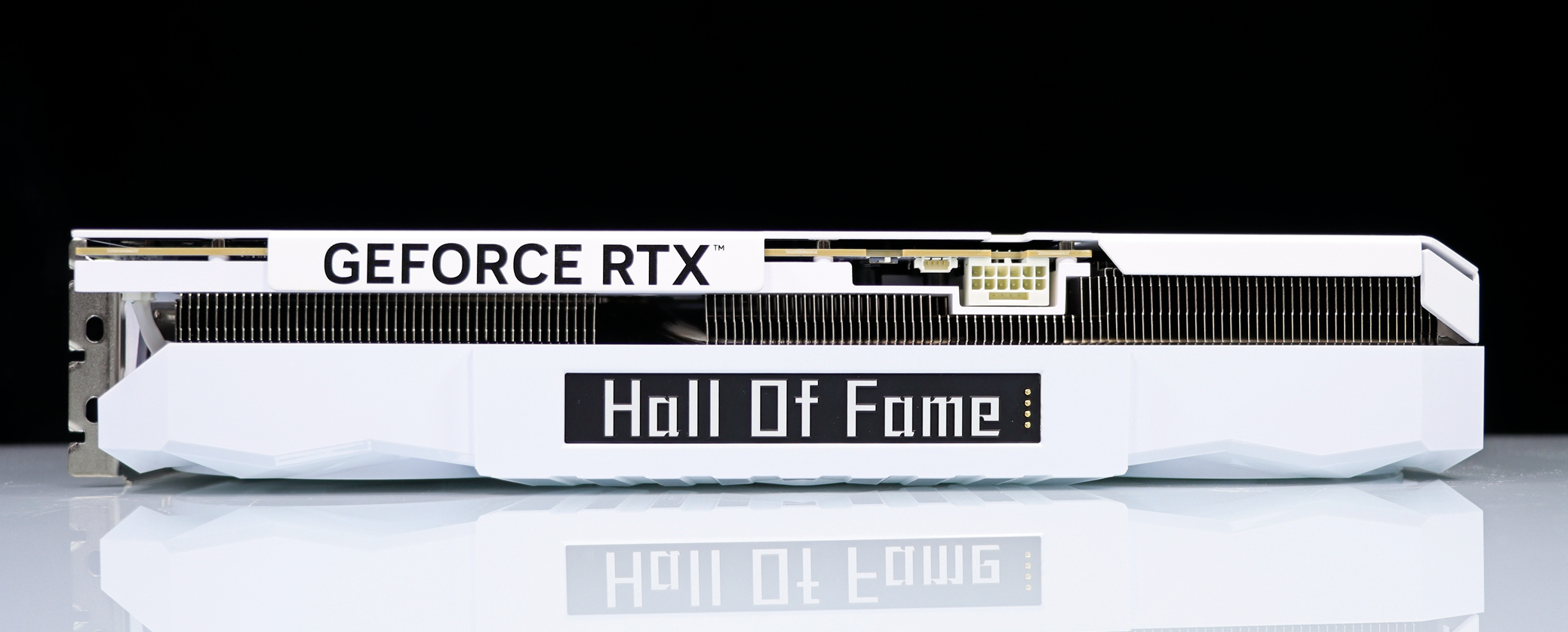 ▲ 对流穿透区域连开孔都是 HOF LOGO 的形状。自然延伸的背板,可以实现对显卡整体的包裹、保护,从而更好地实现引流。