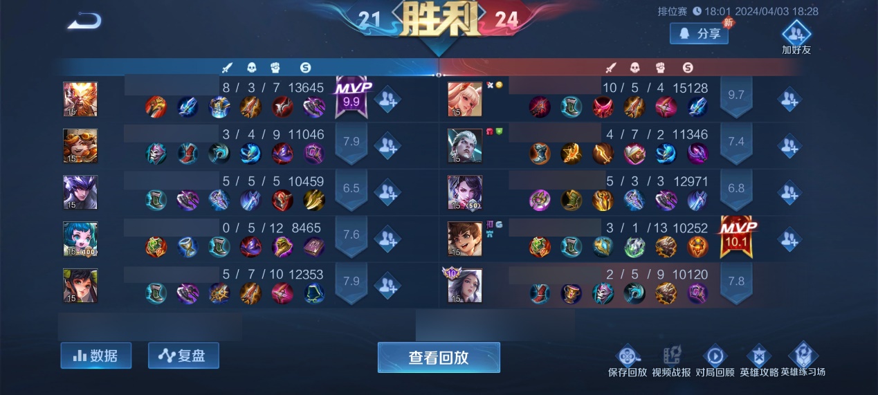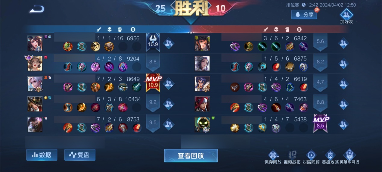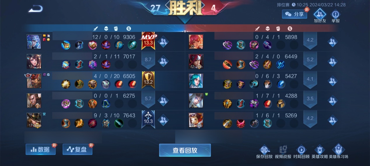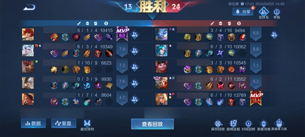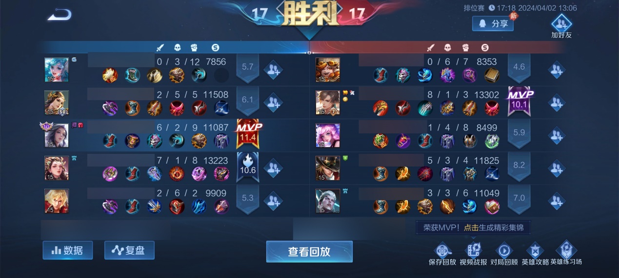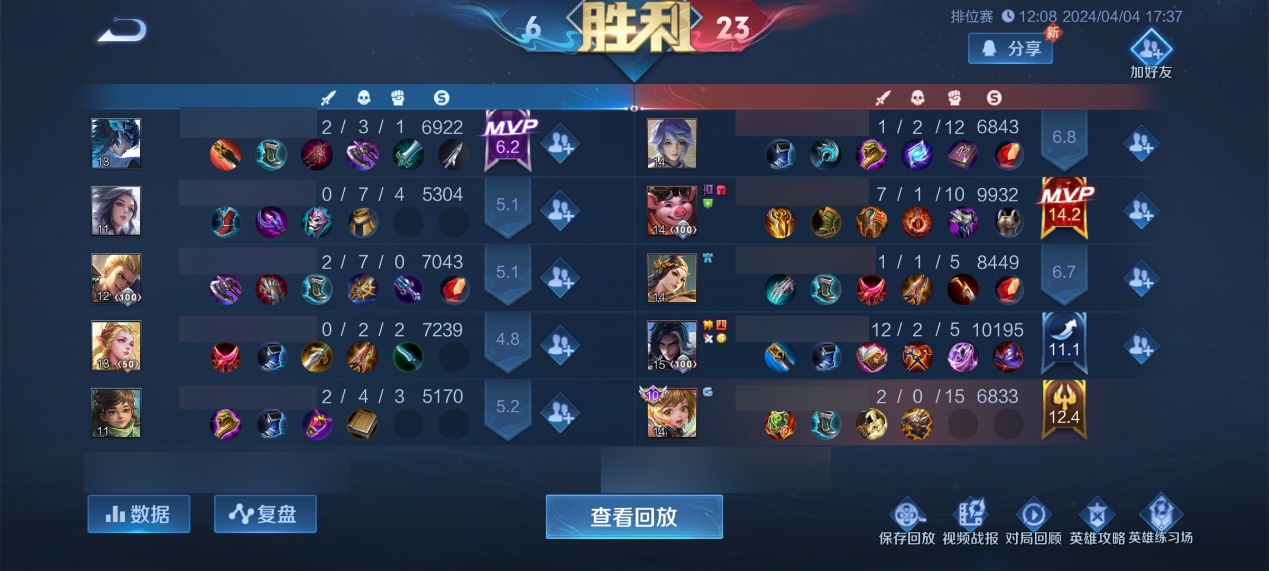 这局也说一下我们自己的问题,就是甄姬,最后一件才出梦魇之牙是有点晚的,最好是前期第一个大件或者是第二个大件就出。